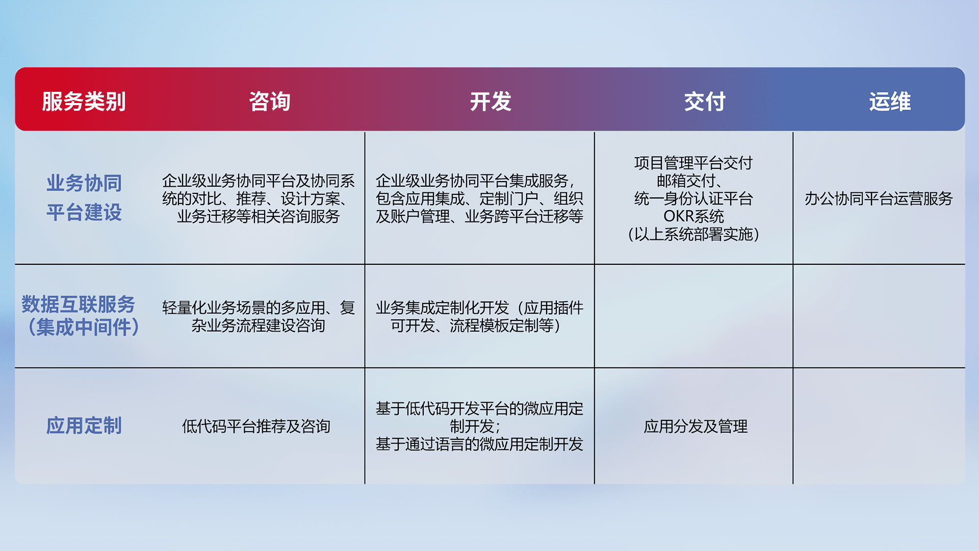 针对钉钉、、企微、、、IDaas等平台级产品提供产品的规划、、、方案、、、、交付、、定制化开发等服务,,,,实现如统一协同办公、、智能客户服务、、混合会议管理、、、智能数据查询、、、、等业务场景,,实现数字化转型。。。